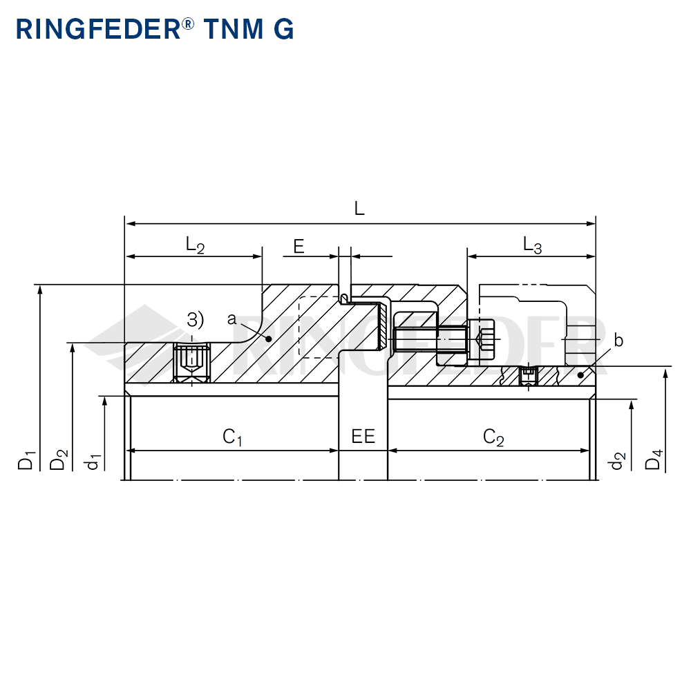 The coupling RINGFEDER® TNM G is a torsionally elastic and puncture-proof claw coupling. It balances out angular, radial, and axial shaft misalignments within defined limits. The coupling transfers the torque via pressure loadable, elastic buffers of synthetic rubber (Pb) which are joined together as an intermediate ring. The elastic intermediate ring can cushion impacts and torsional vibrations; it is oil-resistant and electrically conductive. A coupling half is divided in two and allows through this a simple separation of the coupled machine. With the claw ring pulled back it is possible to check the rotational direction of the drive. It is also possible to lift out radially a coupling half with accompanying aggregate. The elastic intermediate ring can be changed without axially shifting the machine. The coupling is usable in every sense of rotation and installation position.