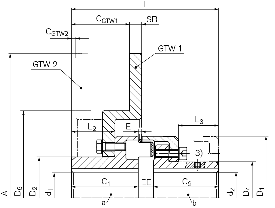 The RINGFEDER® TNM GTW is an torsionally flexible and shock-proof claw coupling with brake disc and removable claw ring. They compensate for angular as well as radial and axial shaft misalignment within fixed tolerances. The torque is transmitted through an elastic transitional ring. The elastic transitional ring made of synthetic rubber (Pb) dampens shocks and torsional vibrations, is oil-resistant and normally electrically conductive. This prevents undesirable static charging, among other things. The coupling can be used for either direction of rotation and be installed in any position. One coupling half consists of a hub and a bolt on claw ring, for easy separation of the coupled machine. With the claw ring unbolted and slid back, a check of the rotational direction of the drive is possible. In the same manner, a coupling half with the associated aggregate can be removed radially. The elastic transitional ring permits replacing of machines without axial displacement.