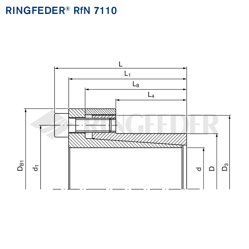 Specially small dimensioned self-centering locking assembly without axial displacement. As the locking screws are located out of the actual clamping area and the pressures are relatively low, the hub can be designed economically small.