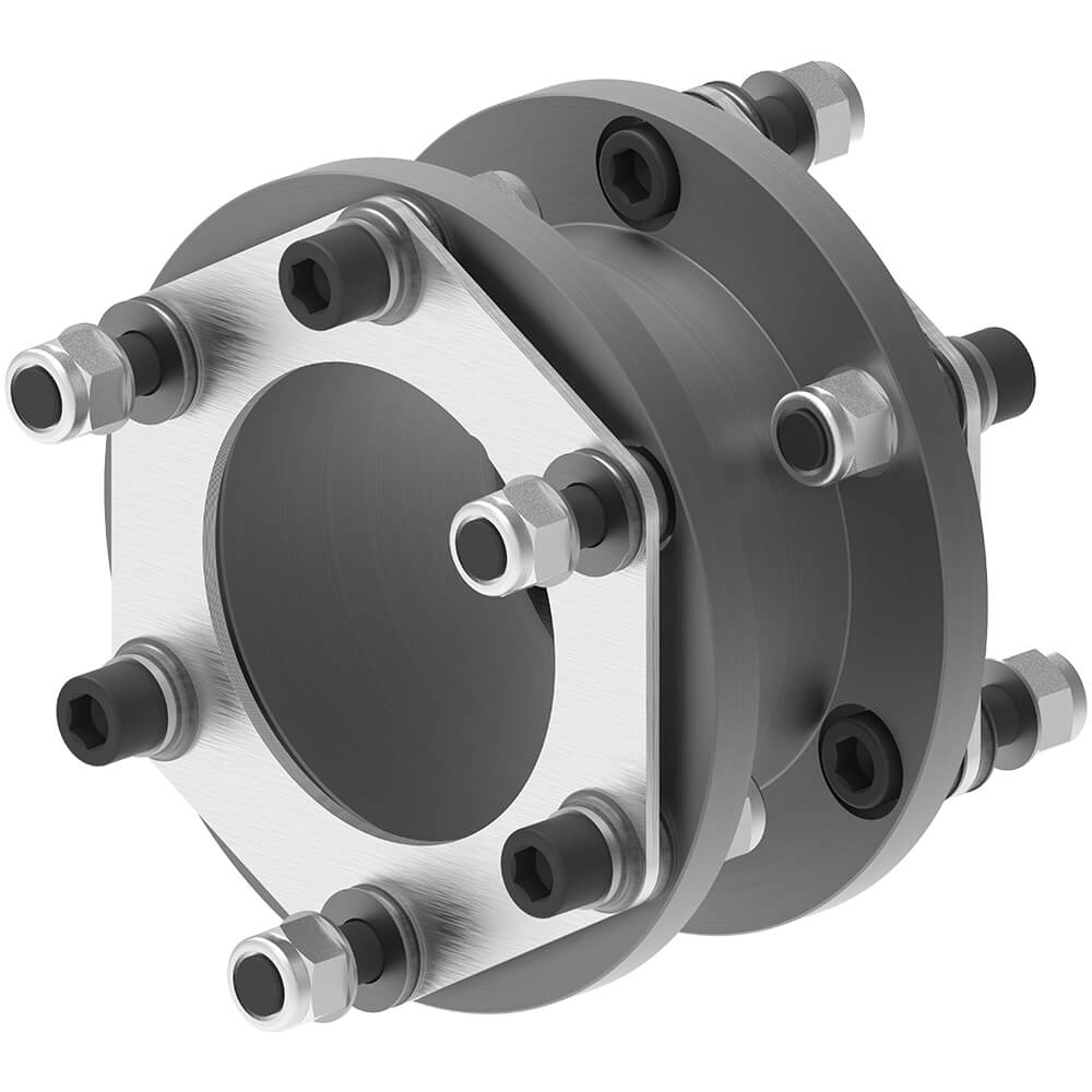 The double-jointed design with two disc packs compensates for radial (adjustable via the spacer length), angular and axial shaft misalignments.