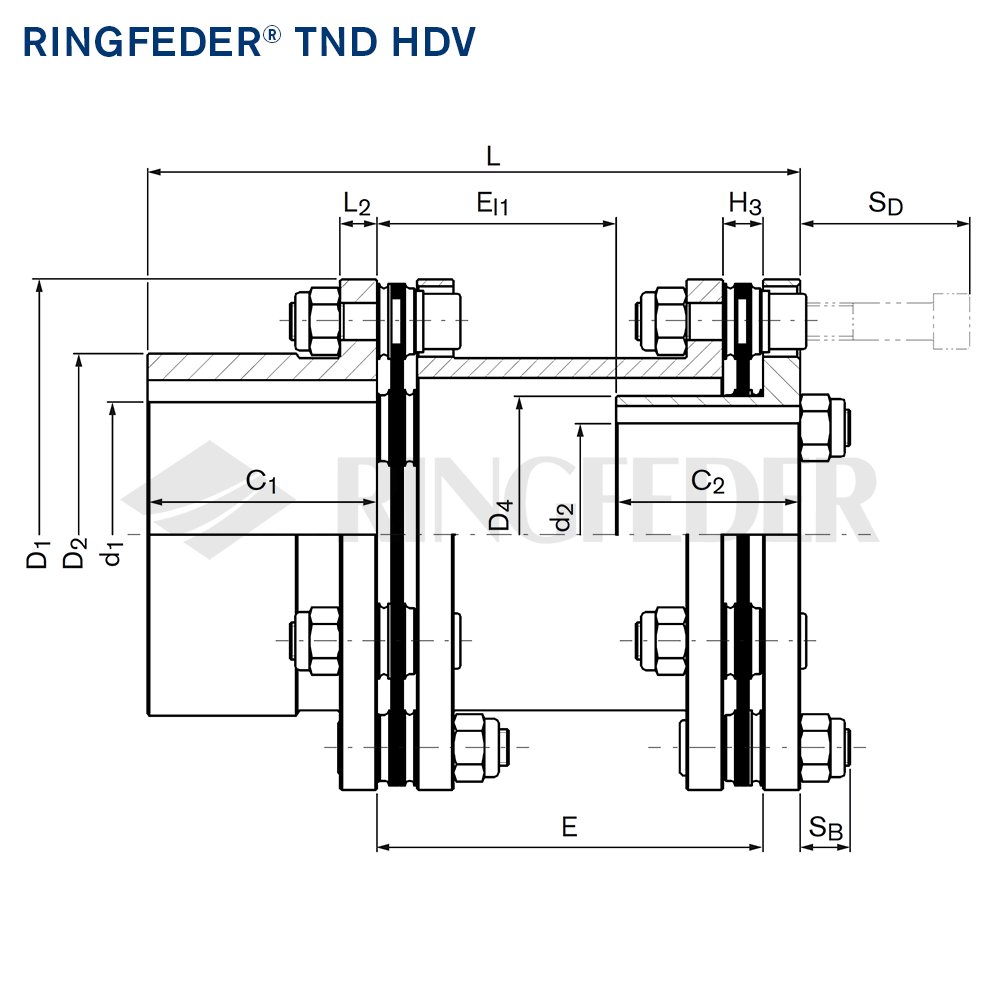 The type RINGFEDER® TND HDV is a torsionally stiff, backlash-free steel disc coupling consisting of a standard hub H and an inverted hub V, connected by a spacer D in standardized or individually customized length. Using high-strength screws, one disc pack each is connected to the spacer and one hub, thus achieving the function of a double-cardanic system.
